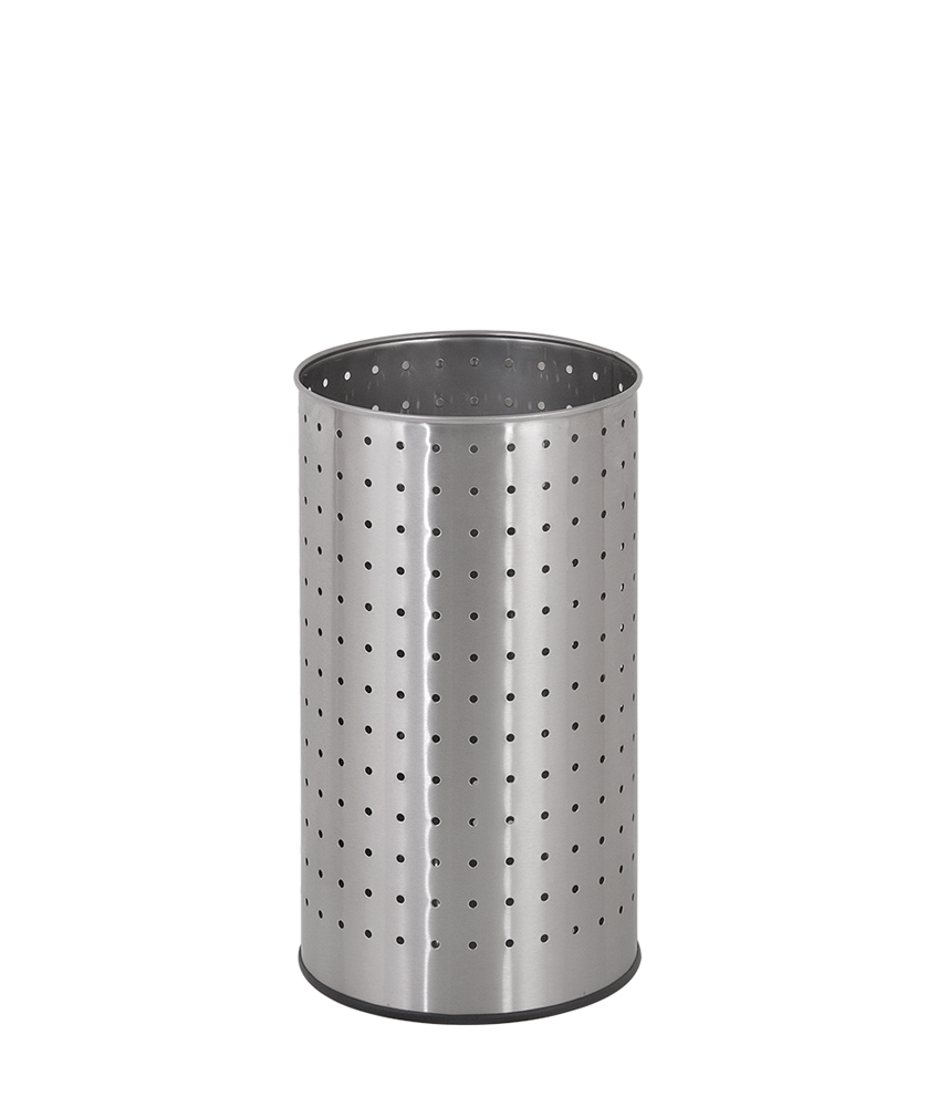 <strong>Medidas: </strong>465mm de altura e 260mm de diâmetro. <br>Papeleira alta redonda com aba superior em chapa perfurada em aço inox (escovado ou brilhante).<p><br></p>