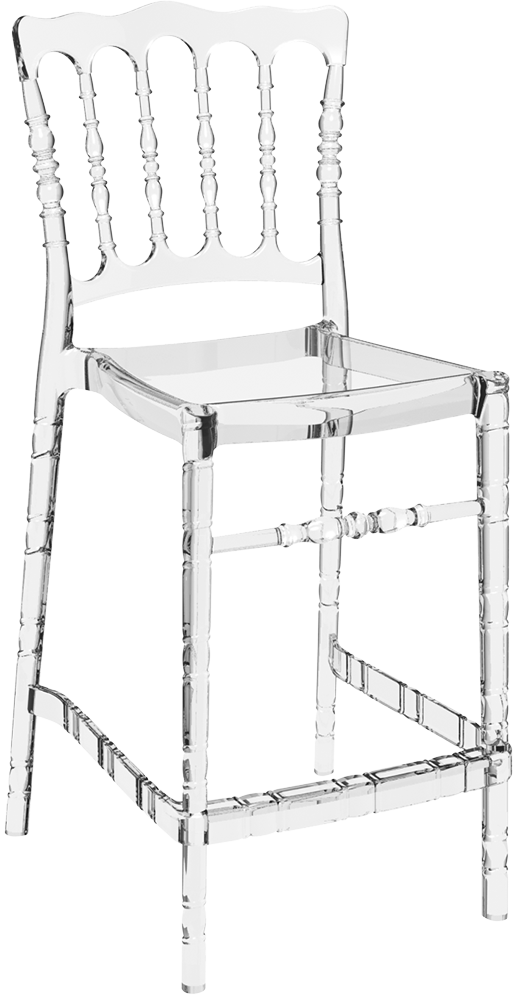Cadeira de bar de casamento empilhável, para uso interno e externo em policarbonato transparente ou brilhante.<br>Resistente a riscos e aos raios UV.