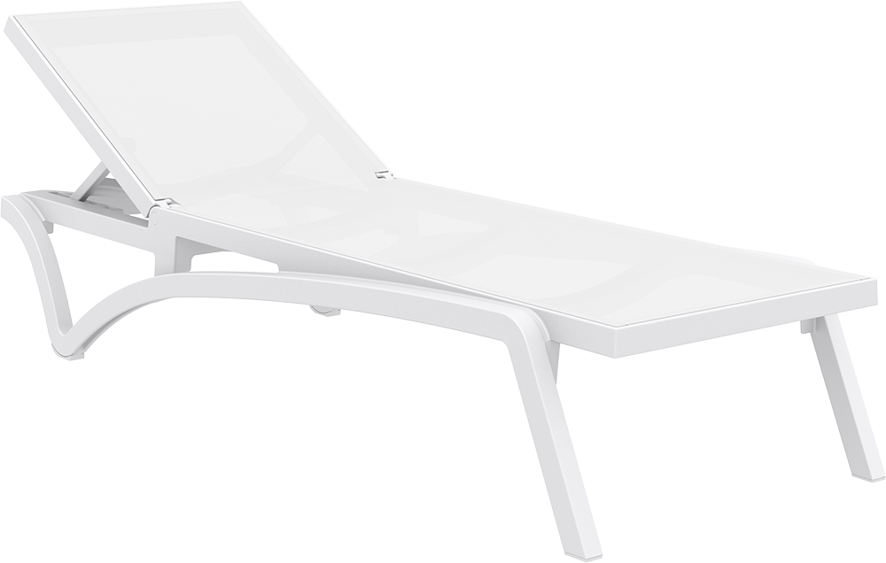 Espreguiçadeira sem braços, estrutura tubular em resina reforçada com fibra de vidro e capa em tecido sintético respirável. Empilhável, encosto reclinável em 5 posições, com pés antiderrapantes e pequenas rodas.